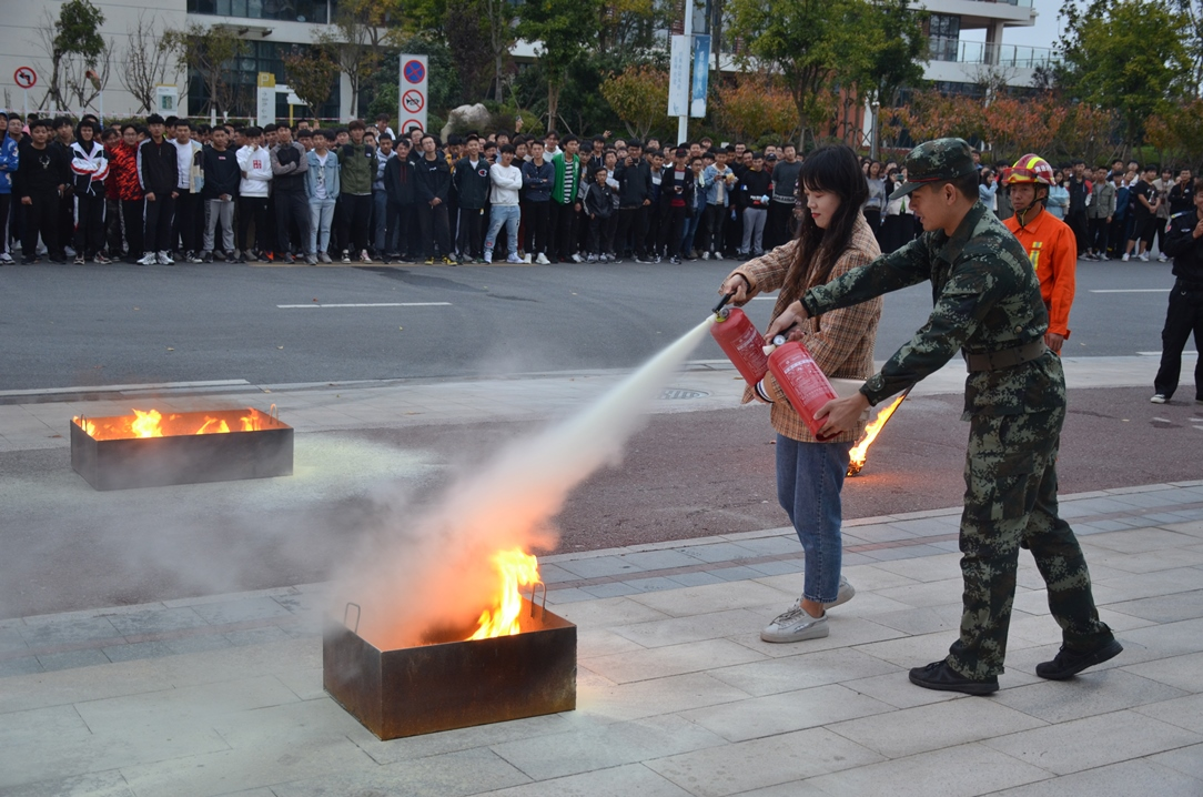 總指揮集合隊伍后,張偉中隊長向師生講解疏散要領、自救技能、逃生注意事項以及滅火器的正確使用方法;消防大隊和東吳保安部隨后布置油盆滅火實操演練,組織60余名師生體現滅火操作,綜治辦對演練活動進行點評;科創城公司副總經理尤麗華和商貿學工處處長施永豐分別講話。